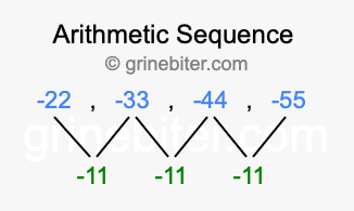 So, what type of sequence is -22, -33, -44, -55? The sequence -22, -33, -44, -55 has a common difference of -11 between each term. We call this kind of sequence an arithmetic sequence. Below is an image illustrating the correlation between the arithmetic sequence -22, -33, -44, -55 and its common difference of -11.