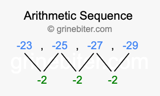 So, what type of sequence is -23, -25, -27, -29? The sequence -23, -25, -27, -29 has a common difference of -2 between each term. We call this kind of sequence an arithmetic sequence. Below is an image illustrating the correlation between the arithmetic sequence -23, -25, -27, -29 and its common difference of -2.