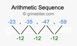 So, what type of sequence is -23, -35, -47, -59? The sequence -23, -35, -47, -59 has a common difference of -12 between each term. We call this kind of sequence an arithmetic sequence. Below is an image illustrating the correlation between the arithmetic sequence -23, -35, -47, -59 and its common difference of -12.
