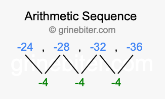 So, what type of sequence is -24, -28, -32, -36? The sequence -24, -28, -32, -36 has a common difference of -4 between each term. We call this kind of sequence an arithmetic sequence. Below is an image illustrating the correlation between the arithmetic sequence -24, -28, -32, -36 and its common difference of -4.
