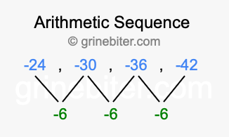 So, what type of sequence is -24, -30, -36, -42? The sequence -24, -30, -36, -42 has a common difference of -6 between each term. We call this kind of sequence an arithmetic sequence. Below is an image illustrating the correlation between the arithmetic sequence -24, -30, -36, -42 and its common difference of -6.