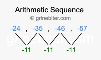 So, what type of sequence is -24, -35, -46, -57? The sequence -24, -35, -46, -57 has a common difference of -11 between each term. We call this kind of sequence an arithmetic sequence. Below is an image illustrating the correlation between the arithmetic sequence -24, -35, -46, -57 and its common difference of -11.