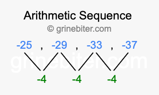 So, what type of sequence is -25, -29, -33, -37? The sequence -25, -29, -33, -37 has a common difference of -4 between each term. We call this kind of sequence an arithmetic sequence. Below is an image illustrating the correlation between the arithmetic sequence -25, -29, -33, -37 and its common difference of -4.