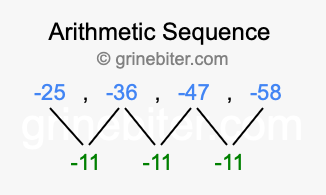 So, what type of sequence is -25, -36, -47, -58? The sequence -25, -36, -47, -58 has a common difference of -11 between each term. We call this kind of sequence an arithmetic sequence. Below is an image illustrating the correlation between the arithmetic sequence -25, -36, -47, -58 and its common difference of -11.