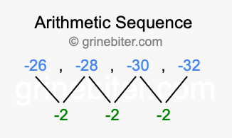 So, what type of sequence is -26, -28, -30, -32? The sequence -26, -28, -30, -32 has a common difference of -2 between each term. We call this kind of sequence an arithmetic sequence. Below is an image illustrating the correlation between the arithmetic sequence -26, -28, -30, -32 and its common difference of -2.