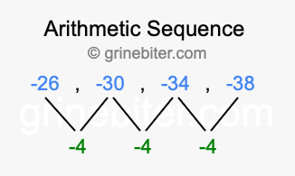So, what type of sequence is -26, -30, -34, -38? The sequence -26, -30, -34, -38 has a common difference of -4 between each term. We call this kind of sequence an arithmetic sequence. Below is an image illustrating the correlation between the arithmetic sequence -26, -30, -34, -38 and its common difference of -4.