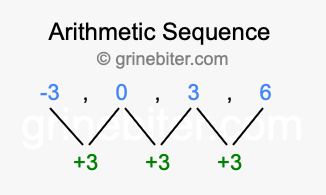 So, what type of sequence is -3, 0, 3, 6? The sequence -3, 0, 3, 6 has a common difference of +3 between each term. We call this kind of sequence an arithmetic sequence. Below is an image illustrating the correlation between the arithmetic sequence -3, 0, 3, 6 and its common difference of +3.