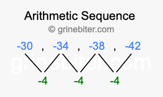 So, what type of sequence is -30, -34, -38, -42? The sequence -30, -34, -38, -42 has a common difference of -4 between each term. We call this kind of sequence an arithmetic sequence. Below is an image illustrating the correlation between the arithmetic sequence -30, -34, -38, -42 and its common difference of -4.