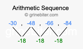 So, what type of sequence is -30, -48, -66, -84? The sequence -30, -48, -66, -84 has a common difference of -18 between each term. We call this kind of sequence an arithmetic sequence. Below is an image illustrating the correlation between the arithmetic sequence -30, -48, -66, -84 and its common difference of -18.