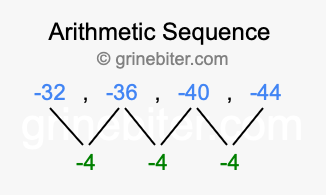 So, what type of sequence is -32, -36, -40, -44? The sequence -32, -36, -40, -44 has a common difference of -4 between each term. We call this kind of sequence an arithmetic sequence. Below is an image illustrating the correlation between the arithmetic sequence -32, -36, -40, -44 and its common difference of -4.
