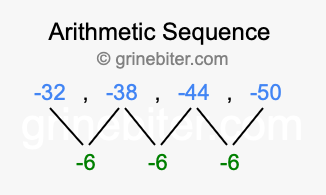 So, what type of sequence is -32, -38, -44, -50? The sequence -32, -38, -44, -50 has a common difference of -6 between each term. We call this kind of sequence an arithmetic sequence. Below is an image illustrating the correlation between the arithmetic sequence -32, -38, -44, -50 and its common difference of -6.