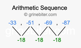 So, what type of sequence is -33, -51, -69, -87? The sequence -33, -51, -69, -87 has a common difference of -18 between each term. We call this kind of sequence an arithmetic sequence. Below is an image illustrating the correlation between the arithmetic sequence -33, -51, -69, -87 and its common difference of -18.