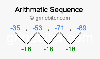 So, what type of sequence is -35, -53, -71, -89? The sequence -35, -53, -71, -89 has a common difference of -18 between each term. We call this kind of sequence an arithmetic sequence. Below is an image illustrating the correlation between the arithmetic sequence -35, -53, -71, -89 and its common difference of -18.