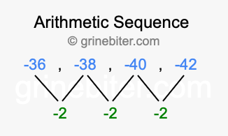 So, what type of sequence is -36, -38, -40, -42? The sequence -36, -38, -40, -42 has a common difference of -2 between each term. We call this kind of sequence an arithmetic sequence. Below is an image illustrating the correlation between the arithmetic sequence -36, -38, -40, -42 and its common difference of -2.