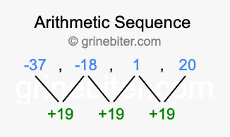 So, what type of sequence is -37, -18, 1, 20? The sequence -37, -18, 1, 20 has a common difference of +19 between each term. We call this kind of sequence an arithmetic sequence. Below is an image illustrating the correlation between the arithmetic sequence -37, -18, 1, 20 and its common difference of +19.
