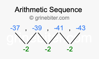 So, what type of sequence is -37, -39, -41, -43? The sequence -37, -39, -41, -43 has a common difference of -2 between each term. We call this kind of sequence an arithmetic sequence. Below is an image illustrating the correlation between the arithmetic sequence -37, -39, -41, -43 and its common difference of -2.