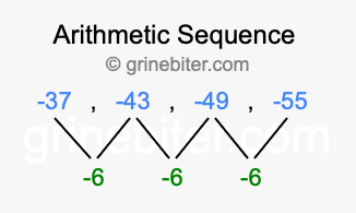 So, what type of sequence is -37, -43, -49, -55? The sequence -37, -43, -49, -55 has a common difference of -6 between each term. We call this kind of sequence an arithmetic sequence. Below is an image illustrating the correlation between the arithmetic sequence -37, -43, -49, -55 and its common difference of -6.