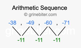 So, what type of sequence is -38, -49, -60, -71? The sequence -38, -49, -60, -71 has a common difference of -11 between each term. We call this kind of sequence an arithmetic sequence. Below is an image illustrating the correlation between the arithmetic sequence -38, -49, -60, -71 and its common difference of -11.