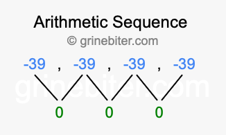 So, what type of sequence is -39, -39, -39, -39? The sequence -39, -39, -39, -39 has a common difference of 0 between each term. We call this kind of sequence an arithmetic sequence. Below is an image illustrating the correlation between the arithmetic sequence -39, -39, -39, -39 and its common difference of 0.