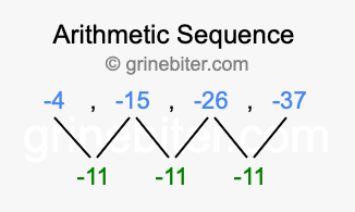 So, what type of sequence is -4, -15, -26, -37? The sequence -4, -15, -26, -37 has a common difference of -11 between each term. We call this kind of sequence an arithmetic sequence. Below is an image illustrating the correlation between the arithmetic sequence -4, -15, -26, -37 and its common difference of -11.