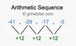 So, what type of sequence is -41, -29, -17, -5? The sequence -41, -29, -17, -5 has a common difference of +12 between each term. We call this kind of sequence an arithmetic sequence. Below is an image illustrating the correlation between the arithmetic sequence -41, -29, -17, -5 and its common difference of +12.