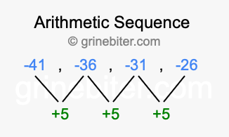 So, what type of sequence is -41, -36, -31, -26? The sequence -41, -36, -31, -26 has a common difference of +5 between each term. We call this kind of sequence an arithmetic sequence. Below is an image illustrating the correlation between the arithmetic sequence -41, -36, -31, -26 and its common difference of +5.