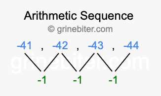 So, what type of sequence is -41, -42, -43, -44? The sequence -41, -42, -43, -44 has a common difference of -1 between each term. We call this kind of sequence an arithmetic sequence. Below is an image illustrating the correlation between the arithmetic sequence -41, -42, -43, -44 and its common difference of -1.