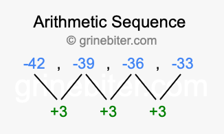 So, what type of sequence is -42, -39, -36, -33? The sequence -42, -39, -36, -33 has a common difference of +3 between each term. We call this kind of sequence an arithmetic sequence. Below is an image illustrating the correlation between the arithmetic sequence -42, -39, -36, -33 and its common difference of +3.