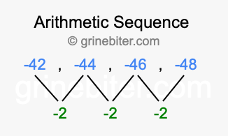 So, what type of sequence is -42, -44, -46, -48? The sequence -42, -44, -46, -48 has a common difference of -2 between each term. We call this kind of sequence an arithmetic sequence. Below is an image illustrating the correlation between the arithmetic sequence -42, -44, -46, -48 and its common difference of -2.