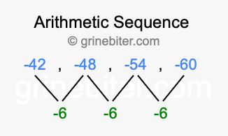 So, what type of sequence is -42, -48, -54, -60? The sequence -42, -48, -54, -60 has a common difference of -6 between each term. We call this kind of sequence an arithmetic sequence. Below is an image illustrating the correlation between the arithmetic sequence -42, -48, -54, -60 and its common difference of -6.