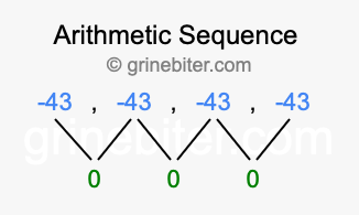 So, what type of sequence is -43, -43, -43, -43? The sequence -43, -43, -43, -43 has a common difference of 0 between each term. We call this kind of sequence an arithmetic sequence. Below is an image illustrating the correlation between the arithmetic sequence -43, -43, -43, -43 and its common difference of 0.