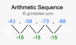 So, what type of sequence is -43, -58, -73, -88? The sequence -43, -58, -73, -88 has a common difference of -15 between each term. We call this kind of sequence an arithmetic sequence. Below is an image illustrating the correlation between the arithmetic sequence -43, -58, -73, -88 and its common difference of -15.