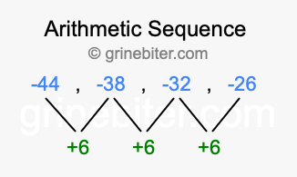 So, what type of sequence is -44, -38, -32, -26? The sequence -44, -38, -32, -26 has a common difference of +6 between each term. We call this kind of sequence an arithmetic sequence. Below is an image illustrating the correlation between the arithmetic sequence -44, -38, -32, -26 and its common difference of +6.