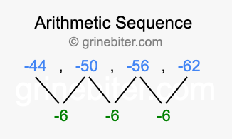 So, what type of sequence is -44, -50, -56, -62? The sequence -44, -50, -56, -62 has a common difference of -6 between each term. We call this kind of sequence an arithmetic sequence. Below is an image illustrating the correlation between the arithmetic sequence -44, -50, -56, -62 and its common difference of -6.