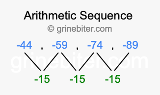 So, what type of sequence is -44, -59, -74, -89? The sequence -44, -59, -74, -89 has a common difference of -15 between each term. We call this kind of sequence an arithmetic sequence. Below is an image illustrating the correlation between the arithmetic sequence -44, -59, -74, -89 and its common difference of -15.