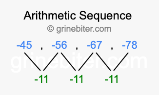 So, what type of sequence is -45, -56, -67, -78? The sequence -45, -56, -67, -78 has a common difference of -11 between each term. We call this kind of sequence an arithmetic sequence. Below is an image illustrating the correlation between the arithmetic sequence -45, -56, -67, -78 and its common difference of -11.