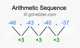 So, what type of sequence is -46, -43, -40, -37? The sequence -46, -43, -40, -37 has a common difference of +3 between each term. We call this kind of sequence an arithmetic sequence. Below is an image illustrating the correlation between the arithmetic sequence -46, -43, -40, -37 and its common difference of +3.
