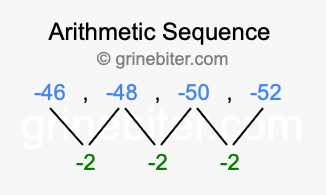 So, what type of sequence is -46, -48, -50, -52? The sequence -46, -48, -50, -52 has a common difference of -2 between each term. We call this kind of sequence an arithmetic sequence. Below is an image illustrating the correlation between the arithmetic sequence -46, -48, -50, -52 and its common difference of -2.