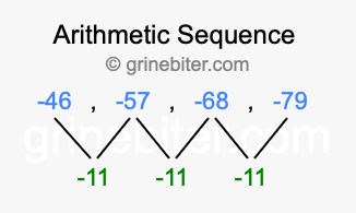 So, what type of sequence is -46, -57, -68, -79? The sequence -46, -57, -68, -79 has a common difference of -11 between each term. We call this kind of sequence an arithmetic sequence. Below is an image illustrating the correlation between the arithmetic sequence -46, -57, -68, -79 and its common difference of -11.