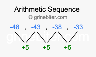 So, what type of sequence is -48, -43, -38, -33? The sequence -48, -43, -38, -33 has a common difference of +5 between each term. We call this kind of sequence an arithmetic sequence. Below is an image illustrating the correlation between the arithmetic sequence -48, -43, -38, -33 and its common difference of +5.