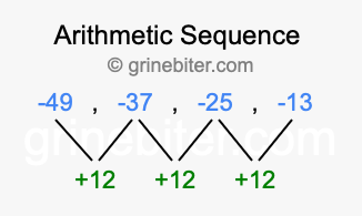 So, what type of sequence is -49, -37, -25, -13? The sequence -49, -37, -25, -13 has a common difference of +12 between each term. We call this kind of sequence an arithmetic sequence. Below is an image illustrating the correlation between the arithmetic sequence -49, -37, -25, -13 and its common difference of +12.