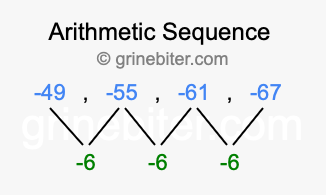 So, what type of sequence is -49, -55, -61, -67? The sequence -49, -55, -61, -67 has a common difference of -6 between each term. We call this kind of sequence an arithmetic sequence. Below is an image illustrating the correlation between the arithmetic sequence -49, -55, -61, -67 and its common difference of -6.