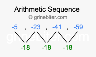 So, what type of sequence is -5, -23, -41, -59? The sequence -5, -23, -41, -59 has a common difference of -18 between each term. We call this kind of sequence an arithmetic sequence. Below is an image illustrating the correlation between the arithmetic sequence -5, -23, -41, -59 and its common difference of -18.