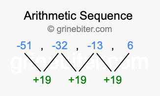 So, what type of sequence is -51, -32, -13, 6? The sequence -51, -32, -13, 6 has a common difference of +19 between each term. We call this kind of sequence an arithmetic sequence. Below is an image illustrating the correlation between the arithmetic sequence -51, -32, -13, 6 and its common difference of +19.