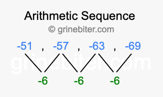 So, what type of sequence is -51, -57, -63, -69? The sequence -51, -57, -63, -69 has a common difference of -6 between each term. We call this kind of sequence an arithmetic sequence. Below is an image illustrating the correlation between the arithmetic sequence -51, -57, -63, -69 and its common difference of -6.
