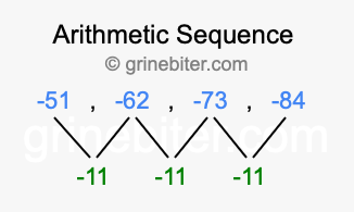 So, what type of sequence is -51, -62, -73, -84? The sequence -51, -62, -73, -84 has a common difference of -11 between each term. We call this kind of sequence an arithmetic sequence. Below is an image illustrating the correlation between the arithmetic sequence -51, -62, -73, -84 and its common difference of -11.