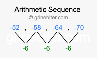 So, what type of sequence is -52, -58, -64, -70? The sequence -52, -58, -64, -70 has a common difference of -6 between each term. We call this kind of sequence an arithmetic sequence. Below is an image illustrating the correlation between the arithmetic sequence -52, -58, -64, -70 and its common difference of -6.