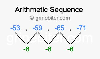 So, what type of sequence is -53, -59, -65, -71? The sequence -53, -59, -65, -71 has a common difference of -6 between each term. We call this kind of sequence an arithmetic sequence. Below is an image illustrating the correlation between the arithmetic sequence -53, -59, -65, -71 and its common difference of -6.