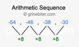 So, what type of sequence is -54, -46, -38, -30? The sequence -54, -46, -38, -30 has a common difference of +8 between each term. We call this kind of sequence an arithmetic sequence. Below is an image illustrating the correlation between the arithmetic sequence -54, -46, -38, -30 and its common difference of +8.