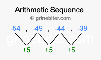 So, what type of sequence is -54, -49, -44, -39? The sequence -54, -49, -44, -39 has a common difference of +5 between each term. We call this kind of sequence an arithmetic sequence. Below is an image illustrating the correlation between the arithmetic sequence -54, -49, -44, -39 and its common difference of +5.